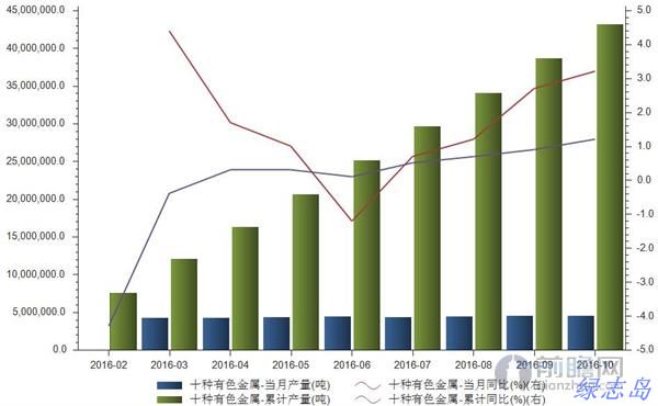 以下為2016年1-10月十種有色金屬產(chǎn)量: